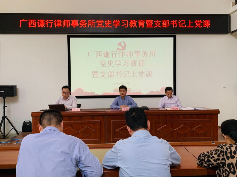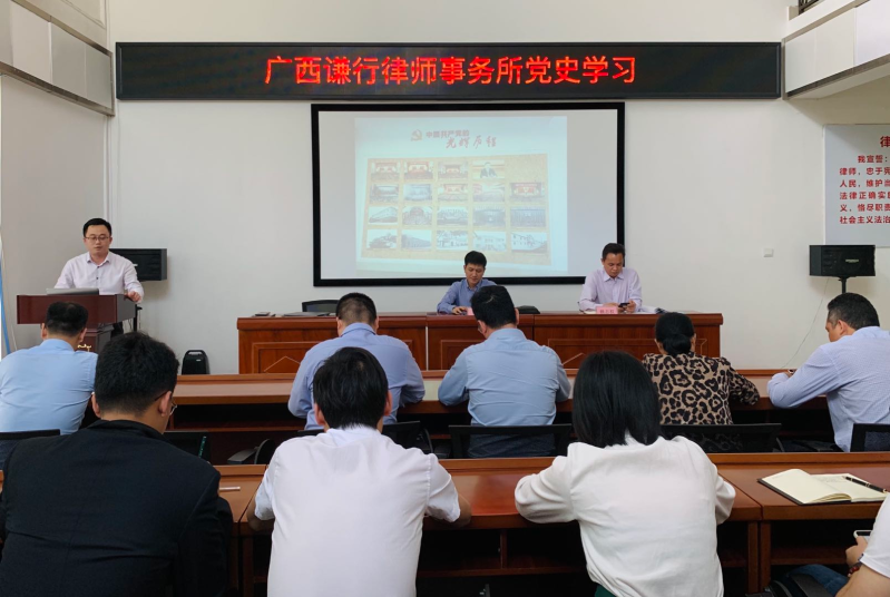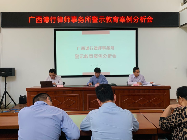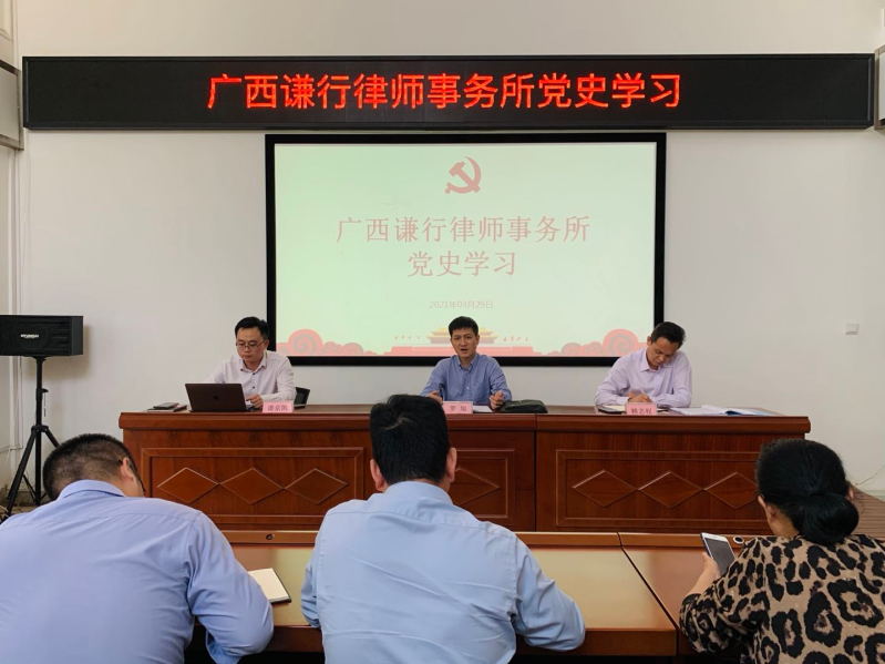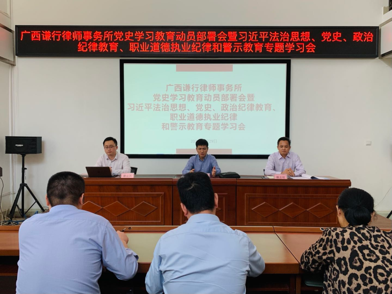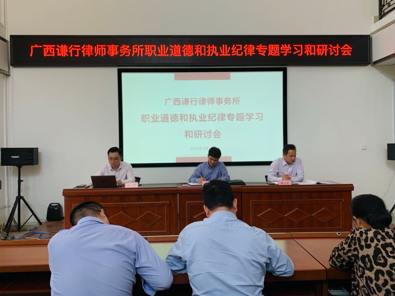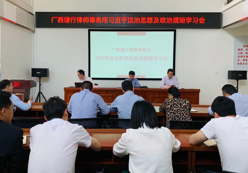 為進(jìn)一步深入貫徹落實(shí)中央、區(qū)市律師隊(duì)伍突出問題專項(xiàng)治理工作會(huì)議精神和黨史學(xué)習(xí)教育會(huì)議精神,3月29日,廣西謙行律師事務(wù)所在謙行模擬法庭召開黨史學(xué)習(xí)教育動(dòng)員部署會(huì)暨習(xí)近平法治思想、黨史、政治紀(jì)律教育、職業(yè)道德執(zhí)業(yè)紀(jì)律和警示教育專題學(xué)習(xí)會(huì)。本所執(zhí)業(yè)律師、實(shí)習(xí)律師參加了本次專題學(xué)習(xí)會(huì)。