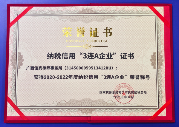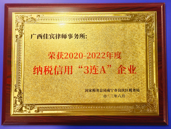 2023年6月,廣西佳賓律師事務所榮獲國家稅務總局南寧市良慶區(qū)稅務局頒發(fā)的2020-2022年度納稅信用“3連A企業(yè)”稱號,并于2023年9月12日收到榮譽牌匾及證書。佳賓所自成立以來就一直堅持依法合規(guī)經(jīng)營,積極依法納稅,履行社會責任。此次納稅信用“3連A企業(yè)”榮譽稱號是國家稅務總局南寧市良慶區(qū)稅務局對佳賓所長期以來誠信經(jīng)營、依法納稅的高度肯定和認可,充分展現(xiàn)了佳賓所良好的企業(yè)形象。佳賓所會一如既往地堅持依法合規(guī)經(jīng)營、誠信納稅,自覺維護好企業(yè)形象,為地方經(jīng)濟發(fā)展貢獻力量。