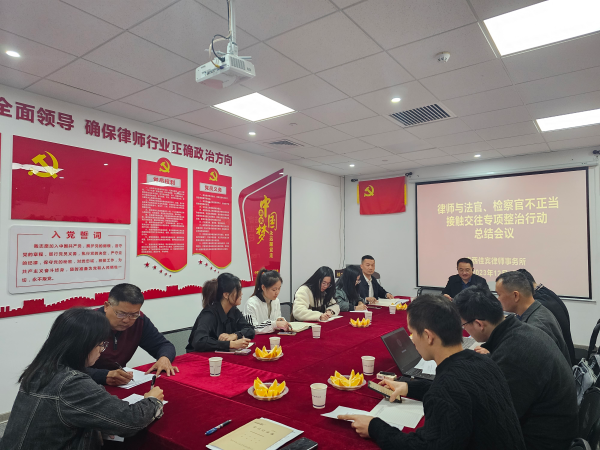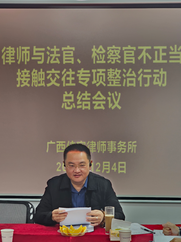 2023年12月4日下午,廣西佳賓律師事務(wù)所在本所大會議室召開律師與法官、檢察官不正當(dāng)接觸交往專項整治行動總結(jié)會議,會議由本所主任王小兵主持。