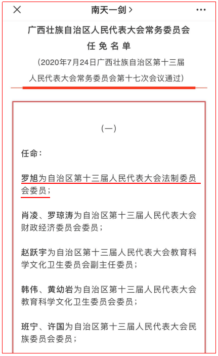 2020年7月24日,自治區(qū)十三屆人大常委會(huì)第十七次會(huì)議在廣西人民會(huì)堂五樓常委會(huì)議廳召開,經(jīng)會(huì)議表決通過,任命自治區(qū)人大代表、廣西謙行律師事務(wù)所主任羅旭律師為自治區(qū)第十三屆人民代表大會(huì)法制委員會(huì)委員。